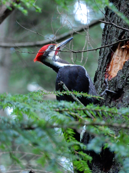 If you’ve ever been walking in a wooded area and heard a sound like loud hammering, you may have been around these magnificent woodpeckers. Another indication of their presence is large holes in dead trees. Woodpeckers feed by pulling the bark off of dead trees to get at insects underneath. They also use large dead tree trunks as a way to announce their presence during courtship by hammering their bills against the tree’s resonating surface.