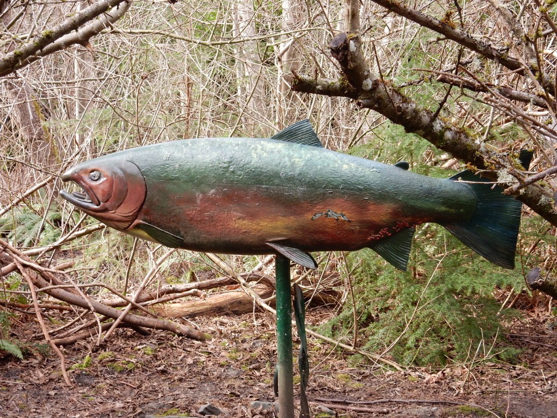 This 7-foot fiberglass sculpture of a spawning coho salmon resides in Puget Gulch, just below Tacoma’s Puget Park. The sculpture was made by students from the Tacoma School of the Arts (SOTA) as part of a public art effort called Soul Salmon 2001.