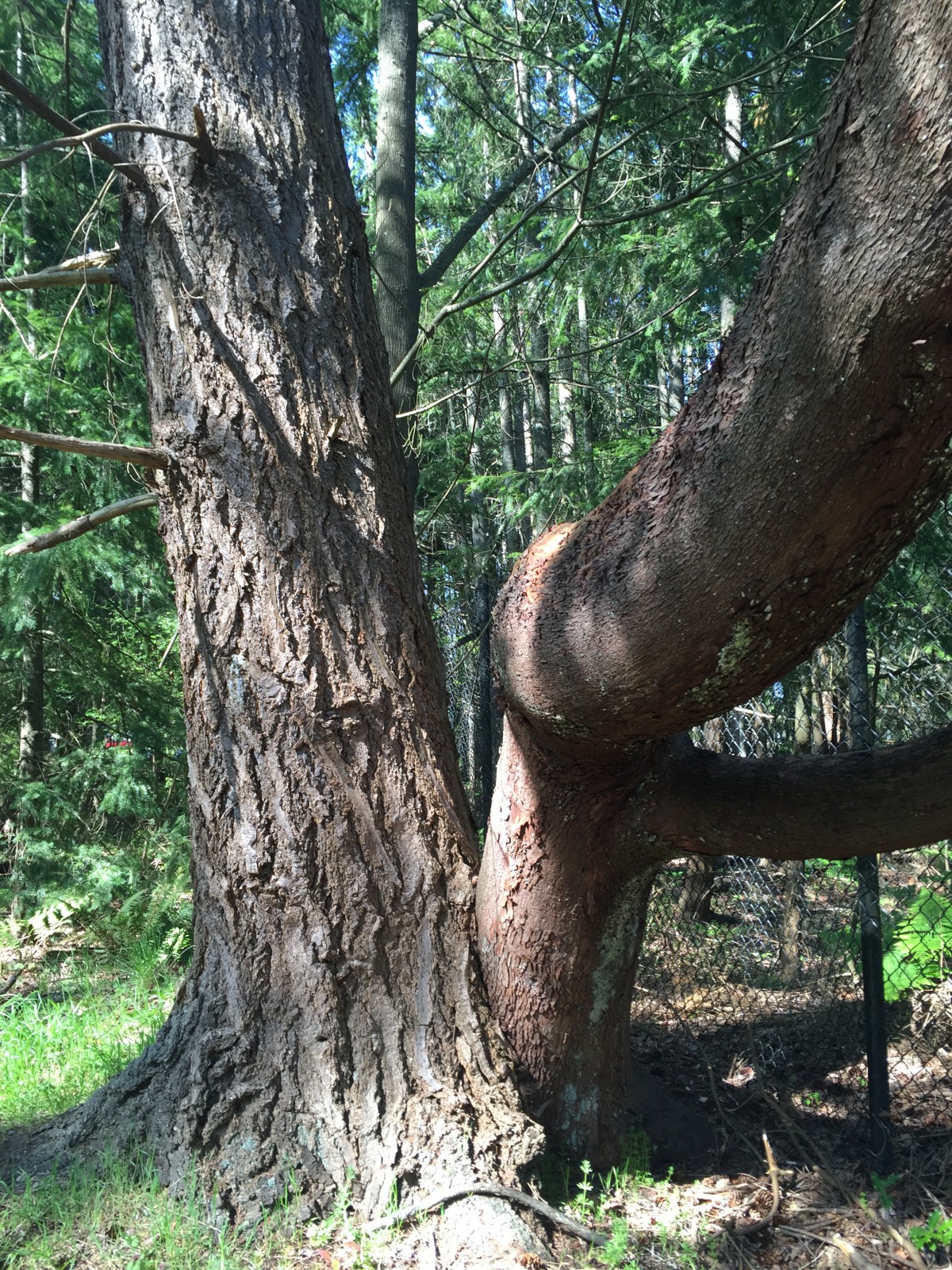 Perhaps these differences are what allowed these two trees to snuggle up so closely while growing. Douglas fir and madronas often grow near each other.