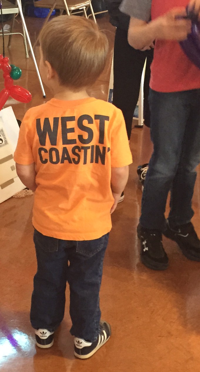 Since retiring from St. Louis, MO, to Tacoma, WA, my husband and I have been enjoying what we think of as West Coasting. So I was delighted to see a little guy wearing this T-shirt: