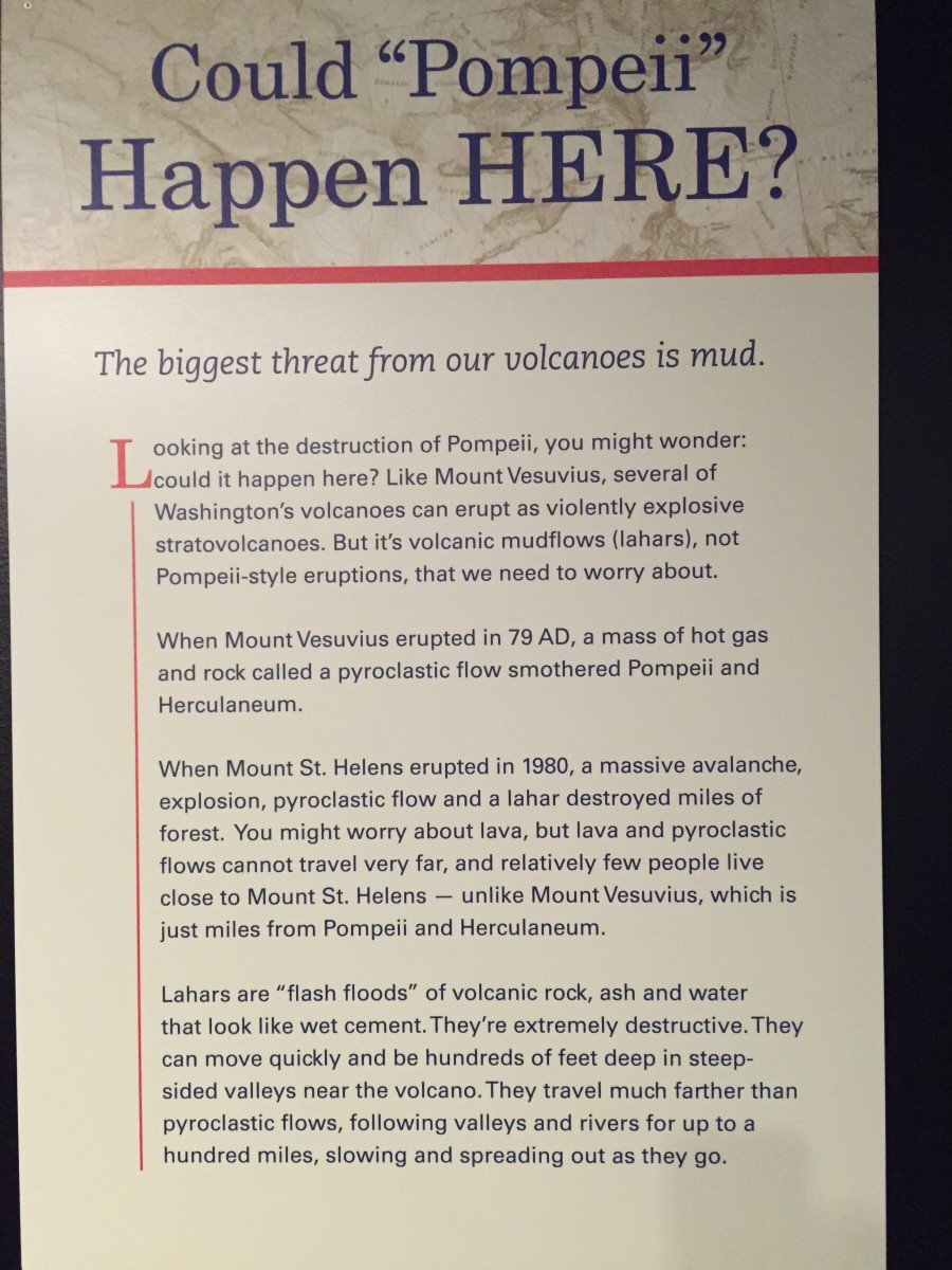 On our recent visit to see Pompeii: The Exhibition, we found the Pacific Science Center in Seattle used the eruption of Mount Vesuvius in Italy in 79 A.D. as a springboard for education about our local situation: