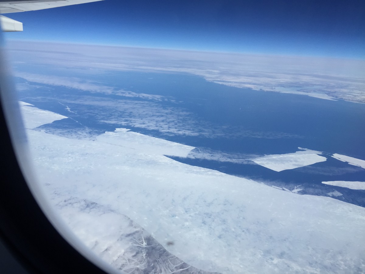 One other nifty feature of the Airbus 330’s video system is the section labeled “this flight,” which shows you a world map with the plane’s projected flight path and current location. Somewhere over the cold North Atlantic I took a break from my movies long enough to raise my window shade and snap this photo: