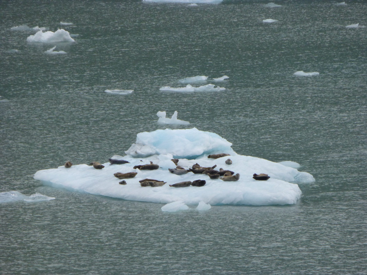 Seals relaxed on several small ice floes that drifted past our ship and out to sea. This was the largest, most highly populated hunk of ice.