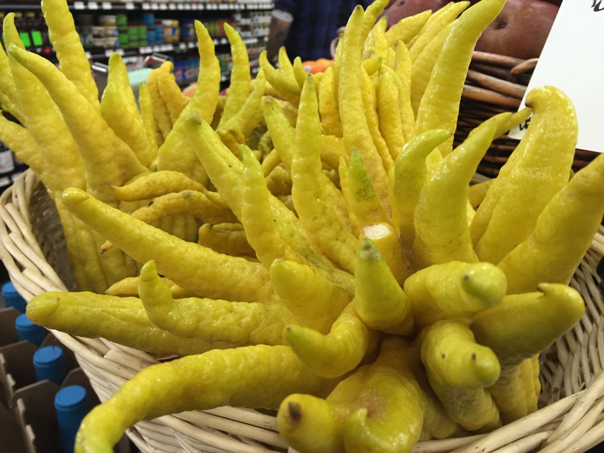 I had never seen or heard of Buddha’s Hand. Once again, the folks at Specialty Produce have it covered: “Buddha’s Hand citron, AKA bushukan (Japanese) or fingered citron, produces deep lemon yellow fruits that vary in shape and size.” Their description says that the flesh is inedible but the oily rind, which is “powerfully fragrant and aromatic,” is valued for its zesting properties. “Buddha’s Hand citron flavor is described as a unique blend of bitter and sweet, similar to kumquats and tangerines, with lavender notes and a bright lemon highlight.”