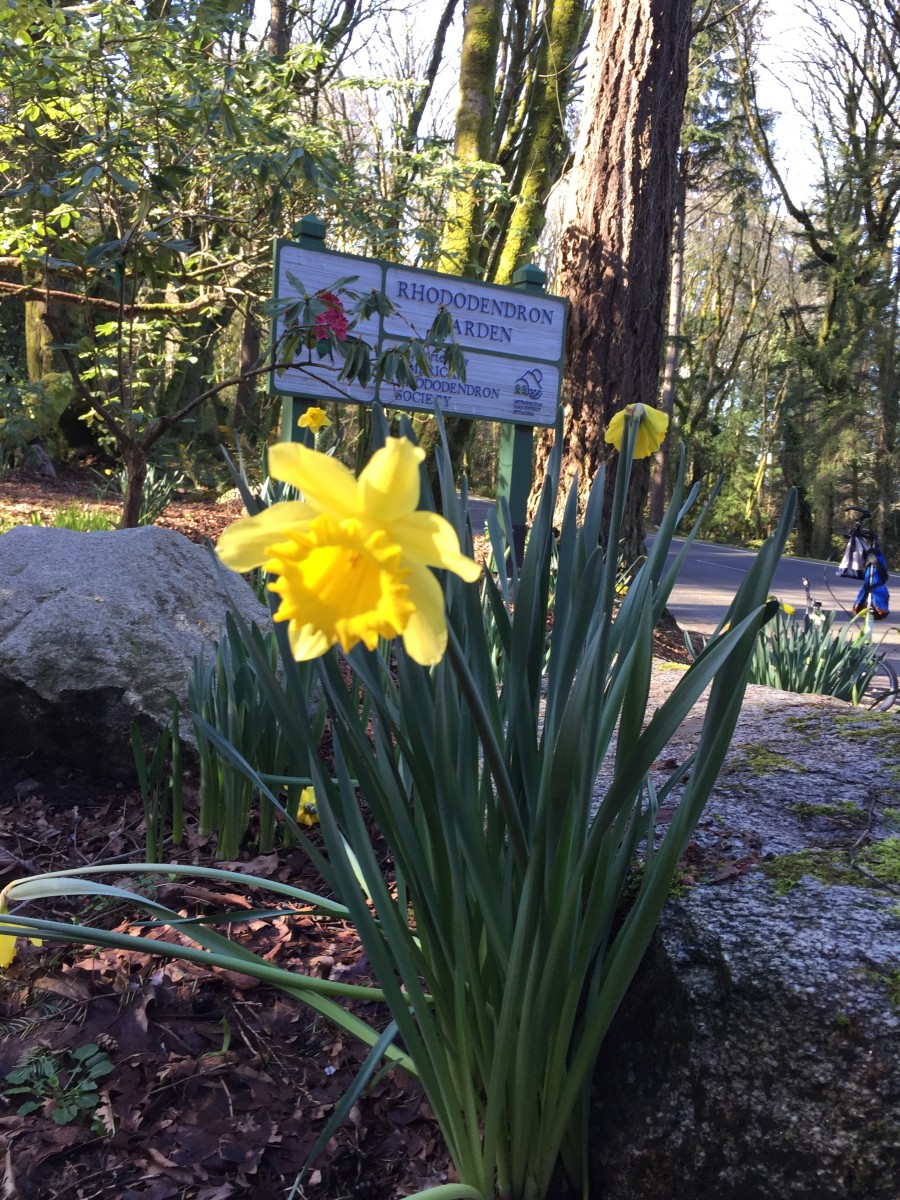 The rhododendrons, Washington’s state flower, aren’t quite in bloom yet, but this daffodil nearby means that it won’t be long: