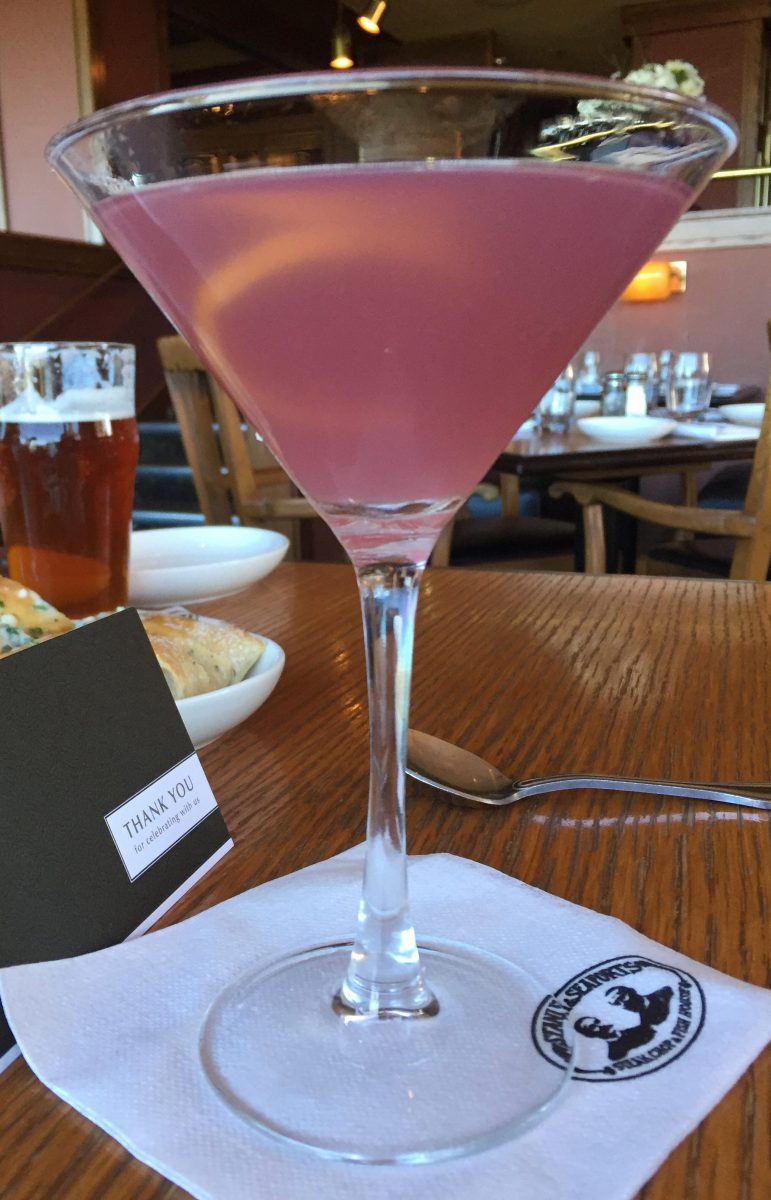 My usual celebratory drink on my birthday is a chocolate martini. But this year my eye fell on the lavender Cosmo on the menu and wouldn’t be denied (purple being my favorite color). So that’s what I started out with: