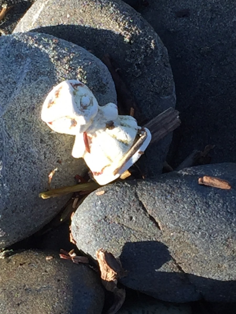 I found this little china figurine, about an inch long, among the stones on Ruby Beach yesterday. What might she represent, and where did she come from? Is some little girl missing one of her personal treasures? Or has the little doll’s disappearance gone unnoticed; if so, why?