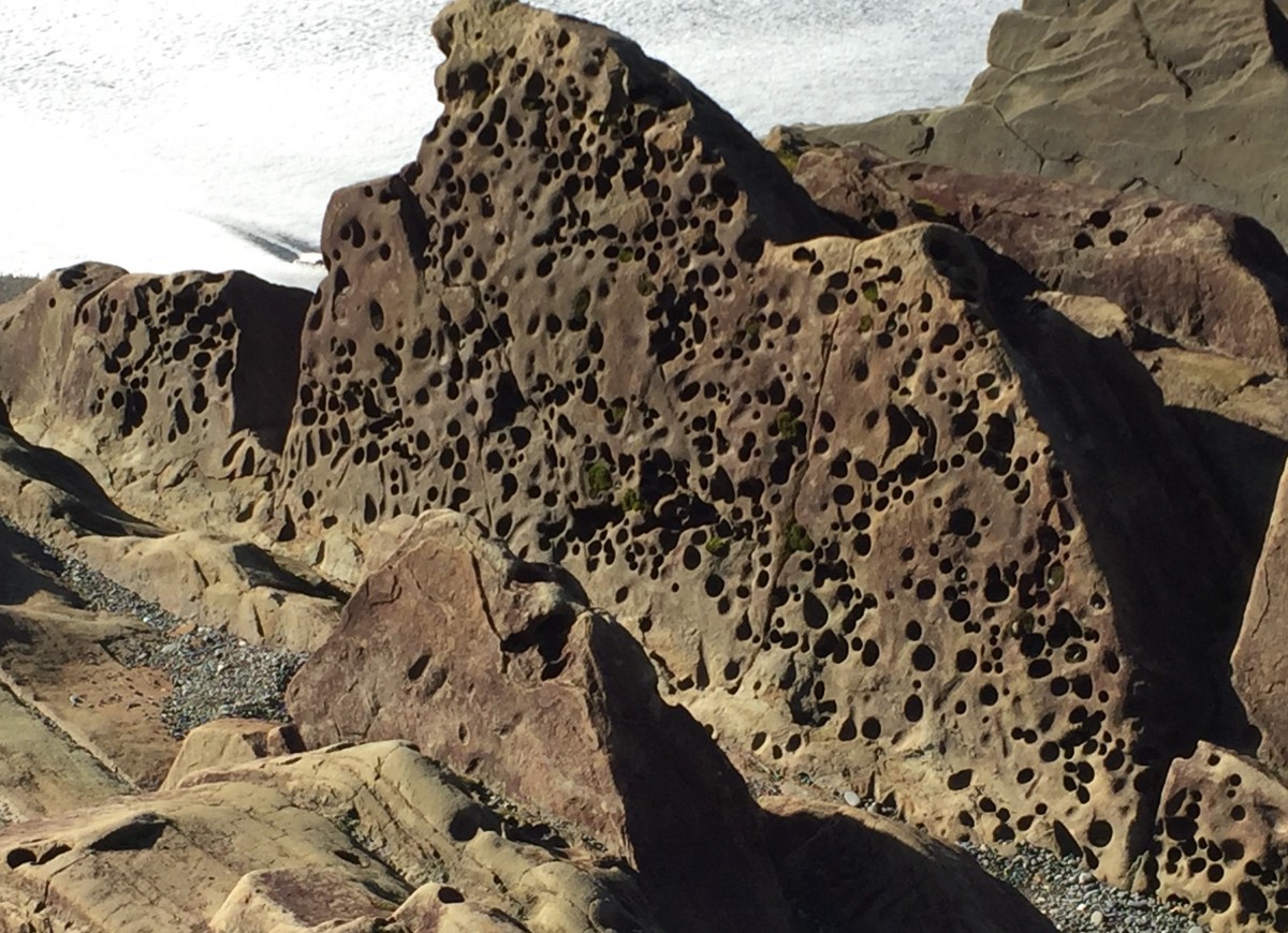 The holes in these rocks at Beach 4 were made by piddock clams, which use a rocking motion to burrow into the sandstone: