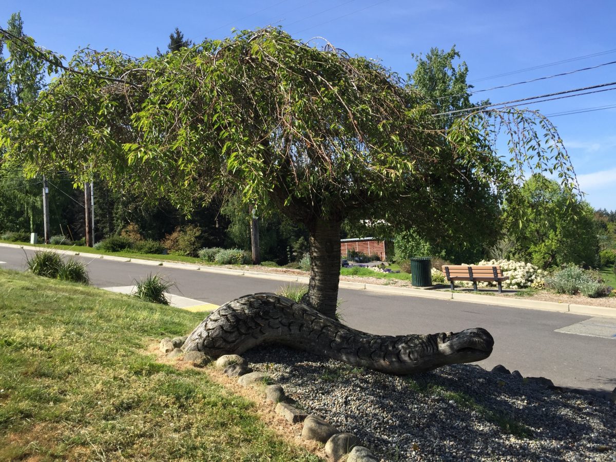 And what would a Pacific Northwest neighborhood on Commencement Bay be without its own resident sea serpent? We came across this clever use of a tree root on one of our walks. I always marvel at examples of such creativity.